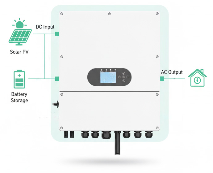 The hybrid inverter combines solar energy, battery storage, and utility grid input to power household devices efficiently. It intelligently switches between sources, charges batteries, and ensures a stable power supply during outages or peak demand.