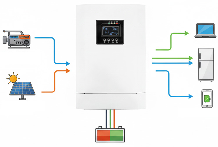 The off-grid inverter operates independently from the utility grid. It converts solar energy (and optional generator input) to power household devices and charge batteries, ensuring a continuous and reliable power supply in remote areas or during outages.